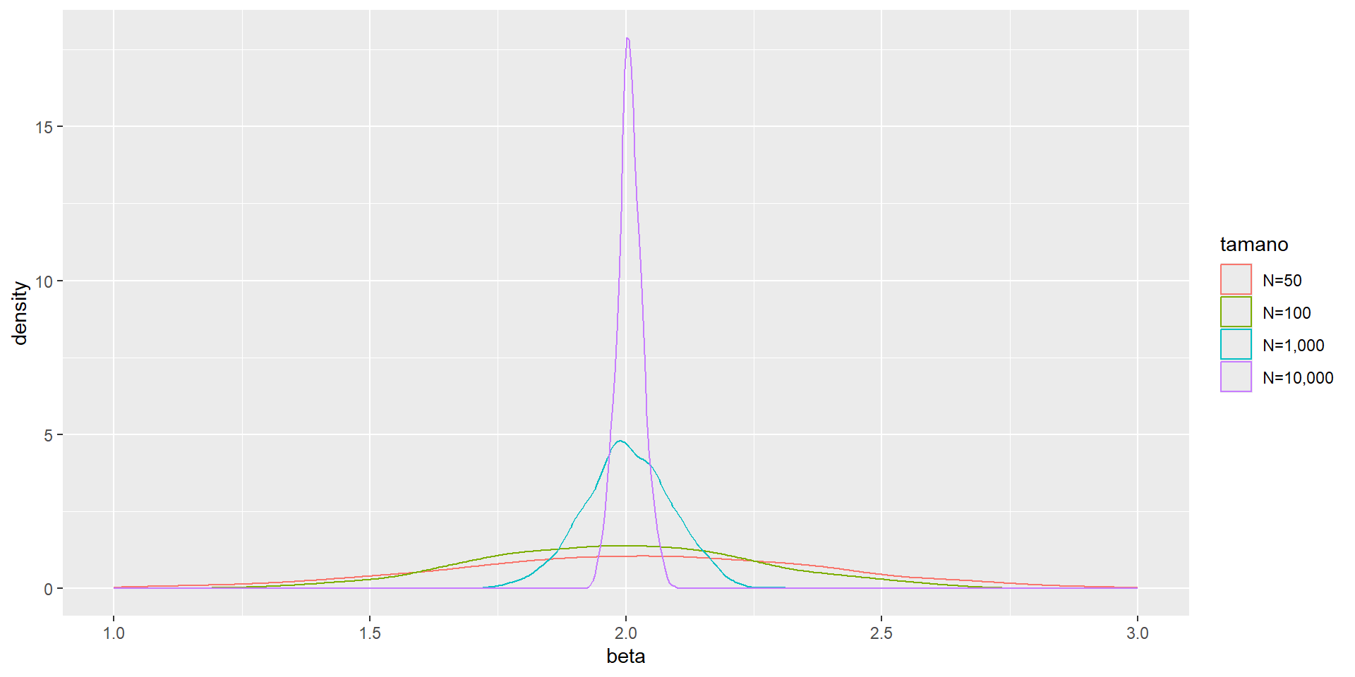 #Dos loopsfor (j in1:length(tamano_muestra)){for (i in1:reps){ muestra <- poblacion[sample(1:100000, size=tamano_muestra[j]), ] estimadores_mco[i,1:2] <-lm(salario ~ educacion, data = muestra)$coefficients estimadores_mco[,3] <- tamano_muestra[j] }#Vamos apilando los resultados en coleccion_estimadores_mcocoleccion_estimadores_mco <-rbind(coleccion_estimadores_mco, estimadores_mco) estimadores_mco <-matrix(ncol =3, nrow = reps)}