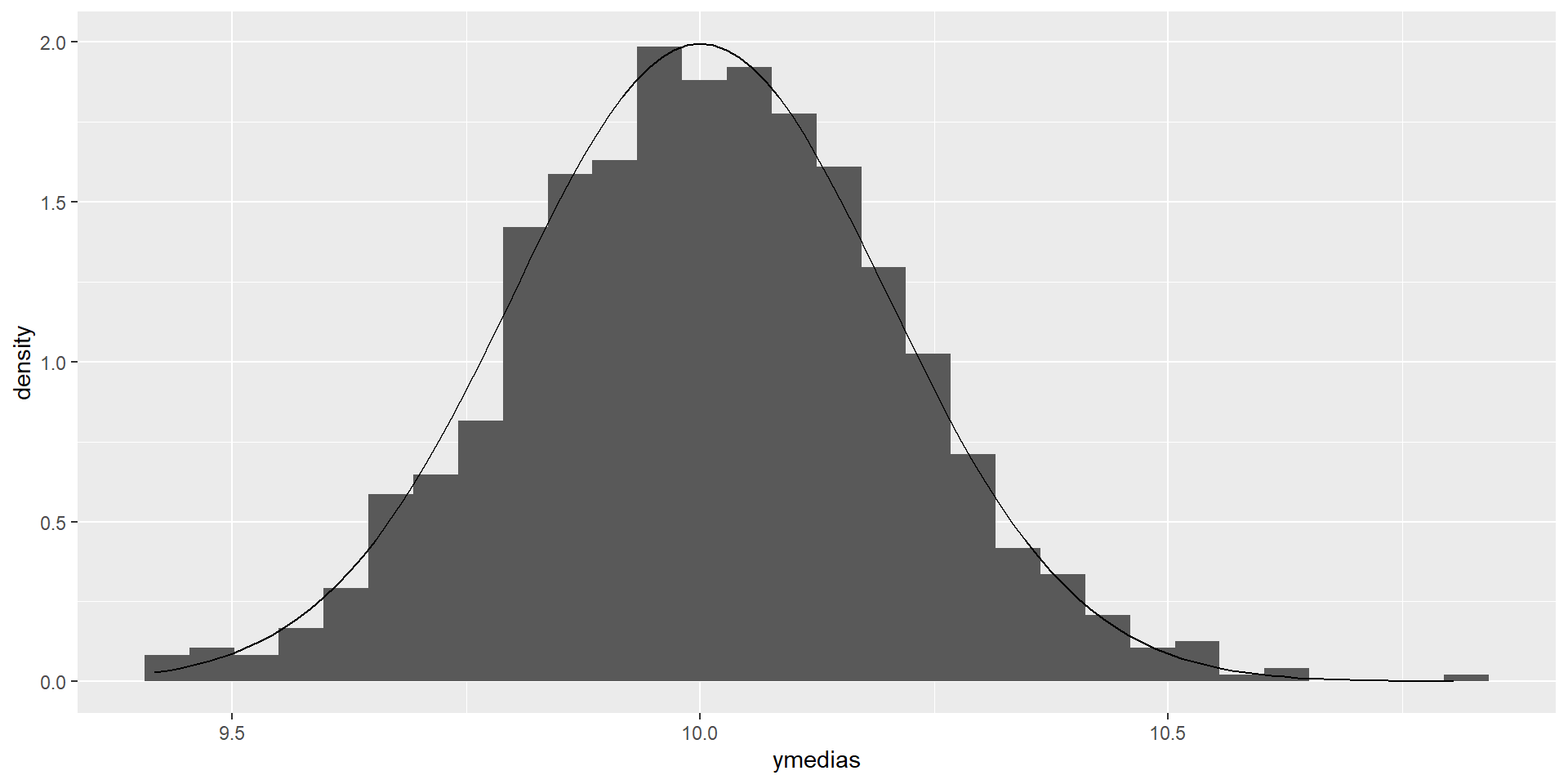 set.seed(820)# Un vector para guardar las medias calculadas. Haremos 1,000 cálculosreps <-1000ymedias <-numeric(reps)# En cada una de las 1000 repeticiones, obtendremos una muestra de tamaño 100for (i in1:reps){ sample<-rnorm(100,10,2) ymedias[i]<-mean(sample)}
