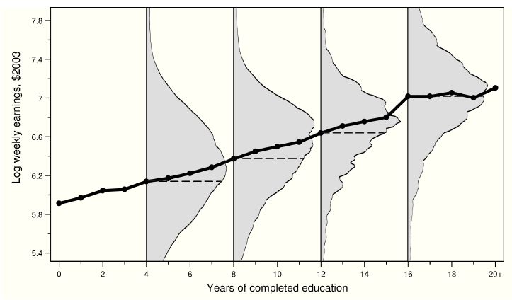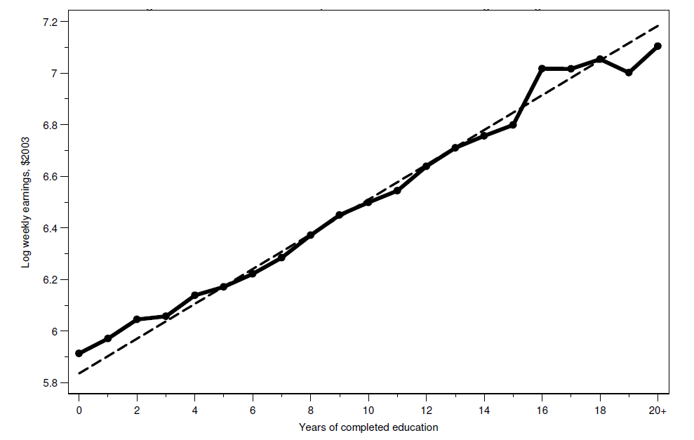 \[y_i=\alpha+\beta_1 c_{1i} + \beta_2 c_{2i} + \ldots + \beta_{21} c_{21i} + u_i\] donde \(c_{ji}=1\) si el individuo \(i\) tiene una educación \(s_{i}=j\)